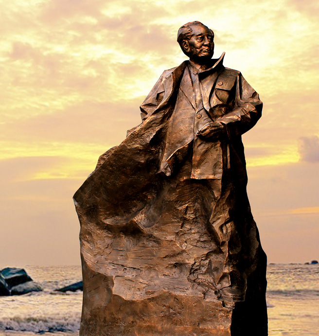 “愈益完美”是在雕塑的情動(dòng)之美里展現(xiàn)出來(lái),雕塑塑造的并不是個(gè)暗啞的人,而是有內(nèi)中情動(dòng),用一種人類(lèi)崇高的方式表達(dá)出來(lái),你可以理解無(wú)聲,但卻掩蓋不了洶涌在作品下,洶涌在大陳島開(kāi)拓者內(nèi)心的情動(dòng),這與雕塑是暗合的,與大陳島亦是暗合。雕塑用“蒙太奇”的手段,將不同的的人物在不同的時(shí)間段活動(dòng)表達(dá)銜接。如電影片段,第一尊“墾拓”雕塑是塑以群雕的形式,有人拾起鐵鍬,有人舉起木夯,還有一人喂哺羊羔,眾人都是不遺余力開(kāi)拓這片疆域。如同雕塑中塑造的旗幟,迎風(fēng)鼓動(dòng),獵獵作響。旗幟的安插,是一種肯定、一種精神的導(dǎo)引,那一群開(kāi)拓者如同將士,將士只有在一片不毛之地墾拓,而并非在開(kāi)拓好了的疆域里征戰(zhàn)。大陳島的開(kāi)發(fā)便也是如此,城市市場(chǎng)飽和,人類(lèi)情感飽和的狀態(tài)下,大陳島的開(kāi)發(fā)是勢(shì)之趨,大陳島的未來(lái)便也如下面的雕塑,是一種觀望,如第二尊“觀望”雕塑,以山體為型,然卻在這之中的變化間,塑造了一尊老人的面容,他在眺望,眼神深邃堅(jiān)定,內(nèi)中透有濃濃的情感,似在望那遲歸的捕魚(yú)人,而老人旁邊同樣鑄造一個(gè)小男孩,他在看,他海的那邊會(huì)是什么,看海上升騰起的紅日,看歸來(lái)的父母。對(duì)美好事物的信仰,這片土地,寄托的是開(kāi)拓者的信仰,他們堅(jiān)信,在努力之下必定結(jié)出碩果,而那第三尊“濠濮間想”雕塑便是他們眼中的美好,他們未來(lái)生活的境遇會(huì)是這樣一幅諧和的畫(huà)面,一妙齡少女坐在海邊礁石上,有海鷗逐浪翻涌,人物與自然界相擁,物我相忘。